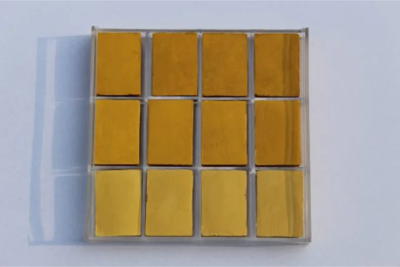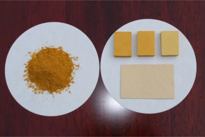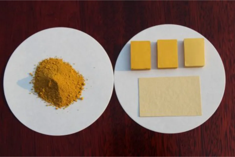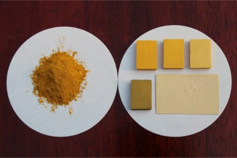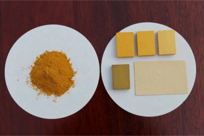 从左到右依次为氧化铁黄301、氧化铁黄920、氧化铁黄313、氧化铁黄313-1。