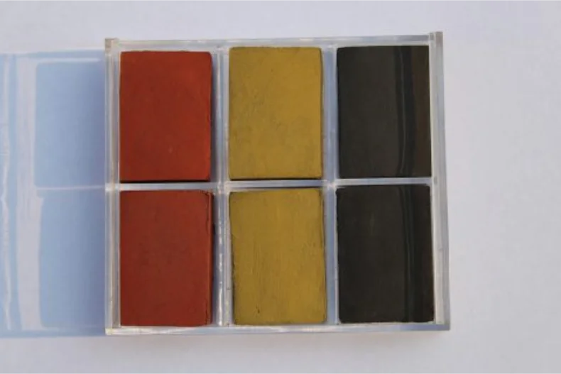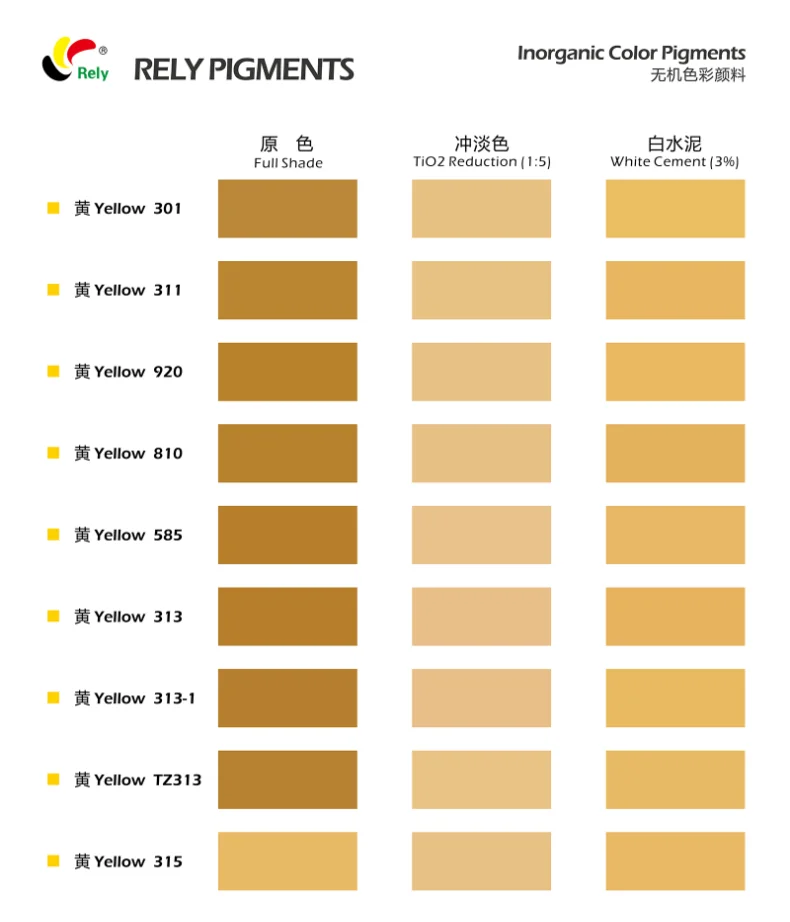 从上到下分别以递减配比加入氧化铁黑与白水泥。 从左到右依次为氧化铁黄301、氧化铁黄920、氧化铁黄313、氧化铁黄313-1。